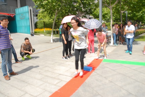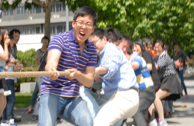 首先开展的是激动人心的拔河比赛,杭城当天32℃的高温也丝毫不能掩盖各位参赛者的热情。学院老师组成的“男神女神队”和学院学生组成的“小鲜肉队”早已按捺不住内心的激动,现场火药味十足。随着裁判一声令下,双方开始奋力拼搏。而比赛的形势似乎从一开始就呈现出一边倒的态势,“小鲜肉队”很快败下阵来,教师代表队赢得了拔河比赛。整齐嘹亮口号和一致的步伐是“男神女神队”获胜的关键因素,而其背后岁月的积淀和成熟的心态或许是更加深层次的原因。而失败的学生代表队也并没有露出失败者惯有的颓势,反而是笑对事实。失败的正确面对方法是坦然,只有这样的失败才能称为成功的铺垫,而我们的同学们似乎早已洞穿一切,相信他们亦从中收获颇丰。