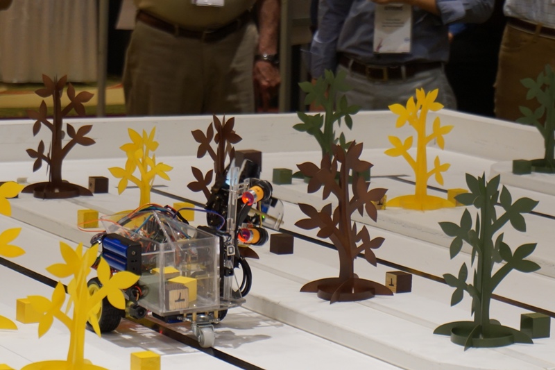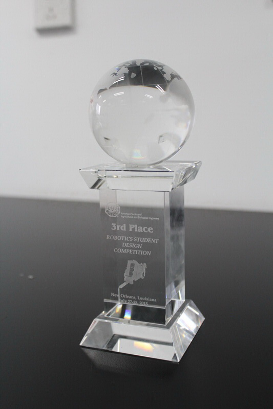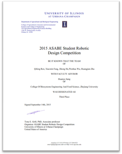本届ASABE学生机器人竞赛要求机器人在8*8英尺的场地中模拟植物表型检测的工作流程,完成一系列诸如判断场地上植株存在的位置,测量植株的高度以及颜色,识别并抓取样品,实时传输植株表型数据等任务。经过场地运行、PPT展示、书面报告、综合评定等激烈的竞争环节,由任奇锋、方小敏、胡季宏、吴文华、祝煌剑等同学组成的bat365正版唯一官网KoChi队,凭借机器人良好的稳定性,战胜了包括德州农工大学(TEXAS A&M),伊利诺伊大学(UIUC),克莱姆森大学(Clemson University)在内的多所大学,荣获本届国际大学生机器人设计竞赛第三名。