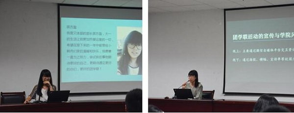 紧接着是团学联七大部门的展示。各位部长精心准备的工作计划和简要凝练的发言让我们看到了他们默默付出的心血汗水。而成员介绍PPT中的一张张全新的面孔让我们看到了团学联的明天。
