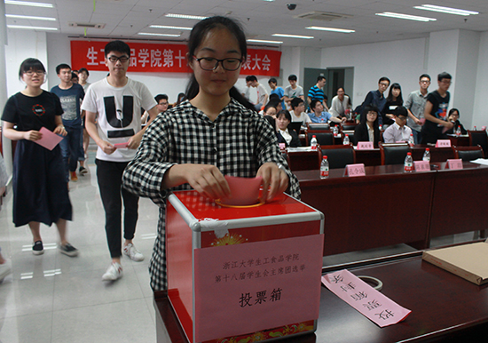 2016年5月27日,生工食品学院第十八次学生代表大会于农生环D座416举行。学院本科生各年级各班级学生代表参加会议并履行代表职权,学院党委副书记陈素珊老师、班主任代表丁甜老师、浙江大学学生会副主席孔令成同学、学院团委副书记张云飞老师出席会议。大会由院学生会副主席方媛媛同学主持。