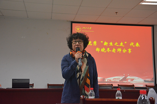 郑晓冬老师作为2015级的优秀新生之友给新一届的新生之友分享了她独到的经验。第一点是要让学生抵御其他的干扰,帮助学生做好角色的转变,这也是学校设立新生之友的初衷。要增加和学生的接触,帮助同学快速适应大学的生活。第二点是关注学生的全面发展。第三点是帮助学生制定学习计划和人生的规划。最后她表示,作为新生之友的同时,自身也收获了很多。