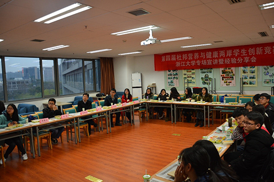 3月16日下午5点至6点半,第四届杜邦竞赛浙江大学专场宣讲暨经验分享会在学院D422(教工之家)举行。中国食品学会但晓雅老师、“杜邦营养与健康”企业专家冰淇淋组经理宗栋先生、食品系副主任朱加进老师以及学院辅导员张云飞老师出席宣讲会。宣讲会的主要分为三个环节,分别是:但老师与宗栋经理的报告与宣讲;往届参赛的学长学姐的经验分享;同学们之间的互动交流。