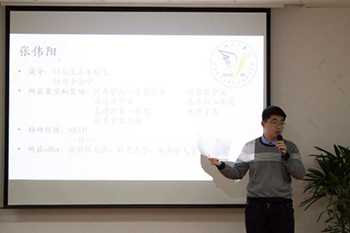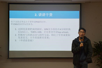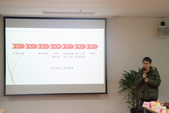 最后登场的是13级生工章禾嘉学长。他目前已获佐治亚大学工程博士全奖offer,学长为大家分享了自己的经历,并且强调了各项基本要求的重要性,指出要尽量的利用身边的资源。