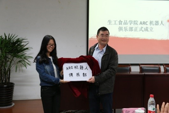 仪式最后,蒋老师为俱乐部揭牌,标志着生工食品学院ARC机器人俱乐部的正式成立。
