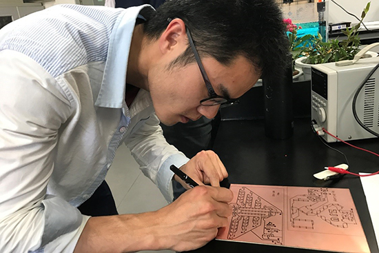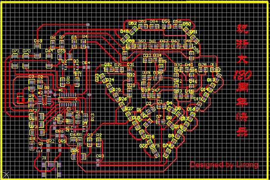 当构思完成后,同学们就用所学的电路软件绘制了原理图,再进行彩灯的电路板设计,这一步需要紧紧围绕创意。然后在实验室进行电路板腐蚀,把不需要的部分除去,最后进行元器件的焊接以及作品调试。