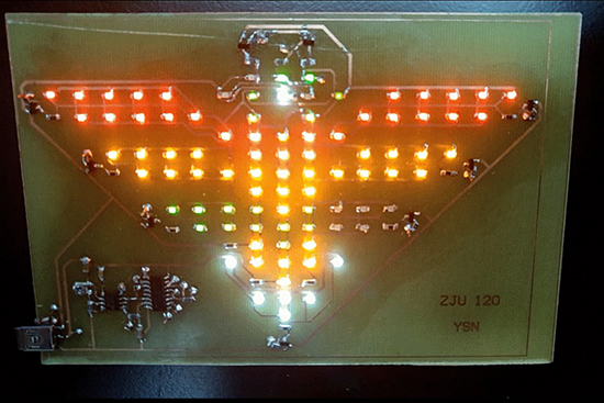 怎么样?喜欢吧!你或许会问,如此酷炫的彩灯,是如何制作的呢?让我们一起走进背后的故事。首先同学们查阅相关文献,在了解彩灯基本电路的基础上,围绕120周年校庆主题,进行彩灯创作。如何在严谨的电子作品中表达活泼的校庆元素,这是非常了不起的技术活,也考验同学们的创新能力。如有的同学在作品中凸显浙大求是鹰,也有的同学重点出现“ZJU 120”,有的同学则把两者有机结合;有的同学巧妙运用光影技术使LED彩灯显示效果更佳,也有同学用精美字体送上祝福,有的则加上亲笔书写的祝福语。总之,每一份创意都以其独特的方式传达着浓浓情意。
