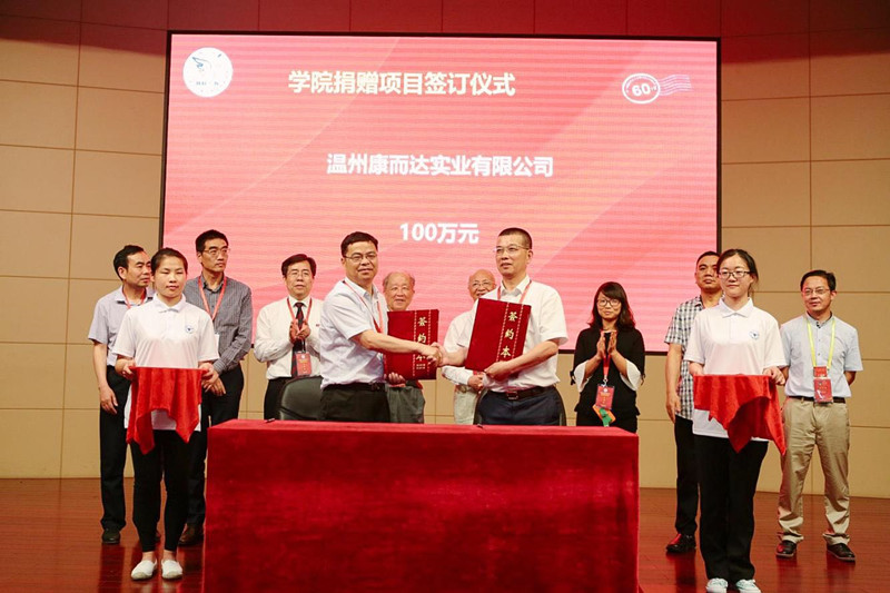 学院校友代表王绍金、李忠先,退休教师代表奚文斌,在校生代表王蕾,学院嘉宾代表温州康而达实业有限公司董事长项伟依次上台发言,表达对学院六十华诞的庆贺和对学院美好未来的祝愿。