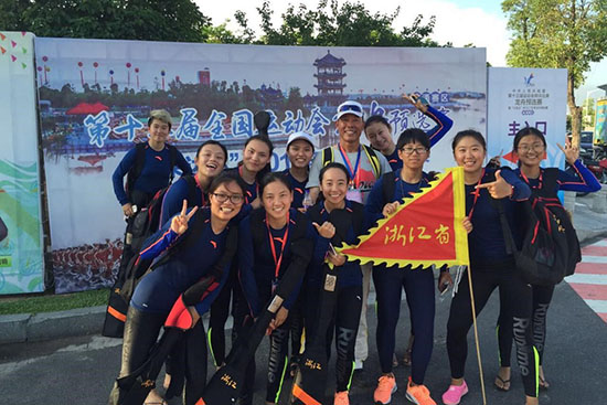 答:有碰到过快撑不下去的时候,因为训练强度很大,体能、技术、力量都要抓,身体上比较痛苦疲惫。另外还得兼顾学习,加上全运会四年一届,任务责任重大,精神压力也不小。在嘉善集训期间,强度更是增加,在大太阳下,经常一划就是十几公里,印象最深刻的是一个早上划了750米*6,用超额的距离为最艰难的500米项目储备充足的能力。