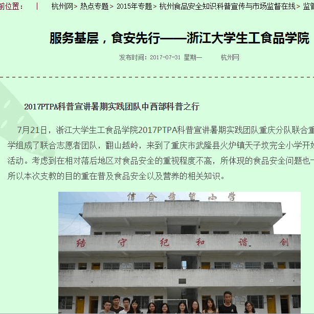 充分发挥社会实践在加强和改进大学生思想政治教育中的重要作用,激发大学生为国家、社会和学校服务的热情,以优异的实践成果献礼学校120周年校庆和学院60周年院庆,迎接党的十九大胜利召开,2017年暑期,生工食品学院选派5支示范队伍、133人开展暑期实践,赴浙江、重庆等省市开展社会实践
