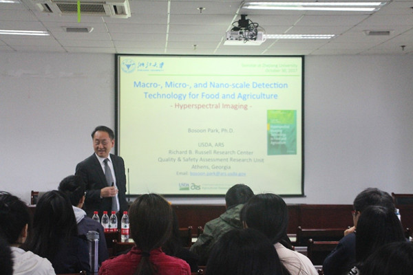 2017年10月31日和11月1日上午,Bosoon Park教授受数字农业与农业物联网创新团队的邀请在学院D416为团队师生分别作了题为“Hyperspectral microscope imaging technology for agricultural and food safety application”和“Nanobiosensing technology to detect foodborne pathogens and toxins”的系列报告。Bosoon Park教授是美国农业部农业科学研究院、美国国家家禽研究中心的首席科学家,佐治亚大学食品科学与技术系兼职教授,美国农业和生物工程师学会ASABE Fellow。
