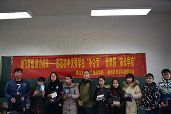 冬令营闭营式上,浙江大学的师生们将特意从浙江大学带来的礼物赠送给同学们。他们在每张浙大纪念明信片上写上了的寄语,并留下联系方式,赠给每一位在场同学,希望可以在孩子们的心中种下一颗理想的种子;他们将印有浙大校徽的日程本送给孩子们,希望孩子们学会规划自己的时间;他们将手套赠送给孩子们,希望他们学会感恩,回家送给自己的爸爸或妈妈,是父母的辛勤的双手撑起了家庭的希望;他们将浙大数学学院蔡天新教授的《数学传奇》奖励给相关优秀学子,让他们从知识中发现快乐,体会学习的乐趣。