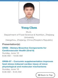 bat365正版唯一官网沈立荣教授团队的主要研究方向为食品营养,本次会上有三个摘要大会摘要经专家评审被录用,其中一个被选为口头报告。610日上午,博士生陈勇在膳食生物活性成分与心血管健康分会场,作了题为“膳食补充姜黄素改善热应激导致的小鼠心脏损伤:生理与分子机制”的精彩报告(oral presentation)。