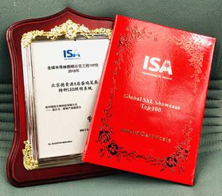 2018年10月23日在深圳召开的国际半导体照明联盟(ISA)成员大会传来好消息,bat365正版唯一官网泮进明教授的产业化成果“北京德青源8层蛋鸡笼养特种LED照明系统”再次荣获“全球半导体照明示范工程100佳”。该成果由杭州朗拓生物科技有限公司(以下简称杭州朗拓)设计并提供产品,北京德青源农业科技股份有限公司(以下简称北京德青源)安装、使用并记录测试效果。北京德青源历时3年、总计10栋的单栋9.4万羽、8层蛋鸡笼养生产数据表明,该成果所使用的蛋鸡特种LED照明技术与产品显著提高了生产效益,饲养达80周,90%以上产蛋率持续40周,累计378枚蛋/鸡。杭州朗拓总经理蒋劲松在会上接受了ISA常务理事、悉尼大学名誉教授Warren Julian的颁奖。