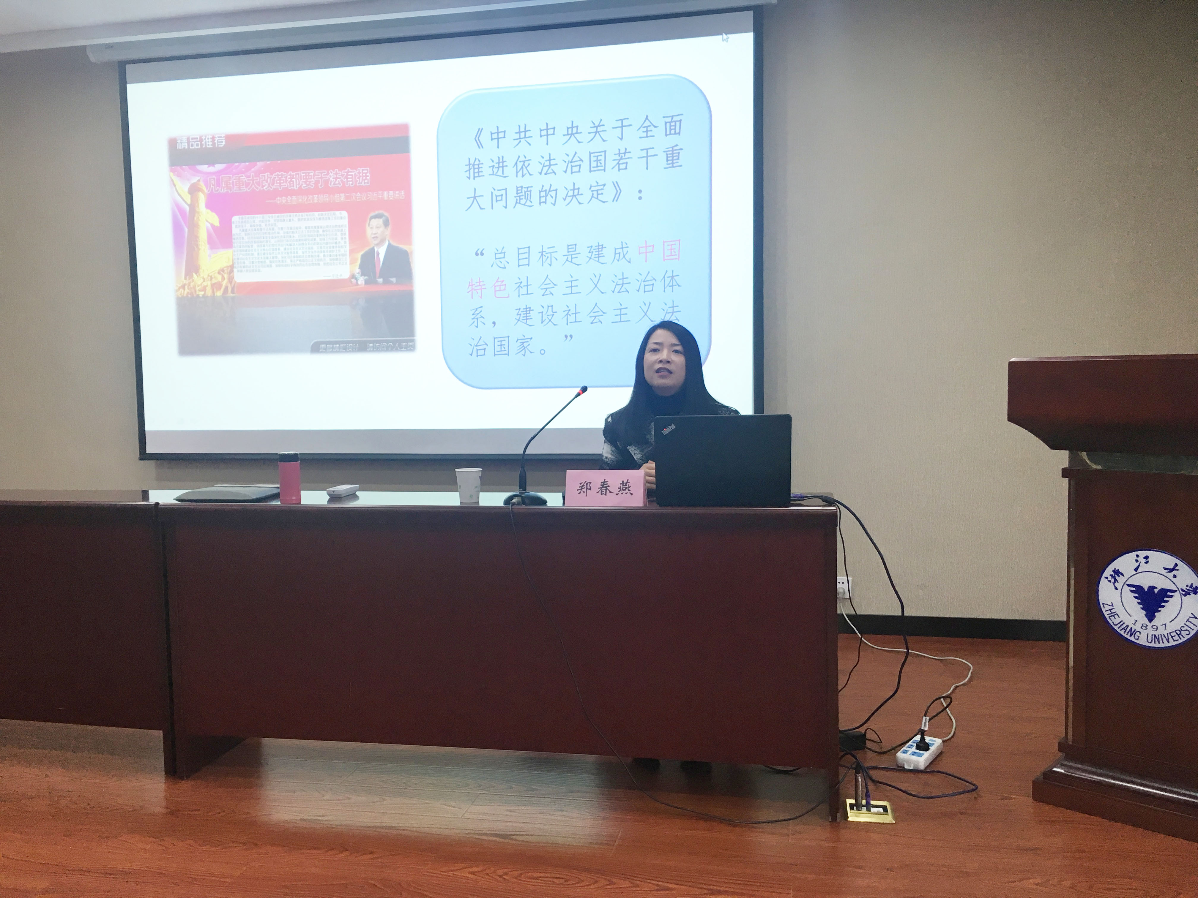 为建成中国特色社会主义法治体系,建设社会主义法治国家,2014年10月中共中央通过了《关于全面推进依法治国若干重大问题的决定》。在此背景下,郑春燕教授结合高等学校法治发展现状及真实案例和切身体会,为党员们讲解了“中外法治与民主”、“威权与法治的内涵以及关系”、“高校独特的法源及高校法治的主体和理念”等内容。