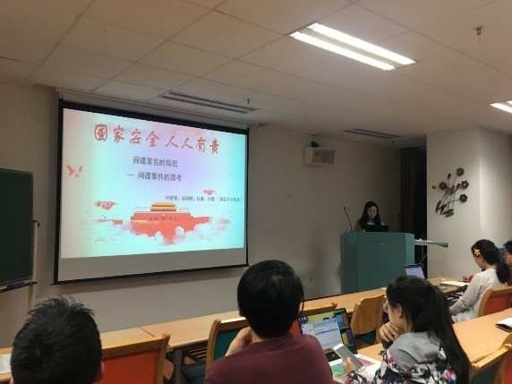 蒋怡然等同学为我们讲解了专业的消防灭火和逃生知识,普及了《消防法》中的责任规定。小组同学用深情的朗诵表达了对于消防英雄的敬仰,是他们将群众的生命财产置于个人安危之上,是他们在逃生的人群中逆流而上,最后他们推荐了央视纪录频道消防纪录片《119!》,介绍了英雄们的消防工作的点点滴滴,平凡而伟大的工作是怎样在烈火中造就。