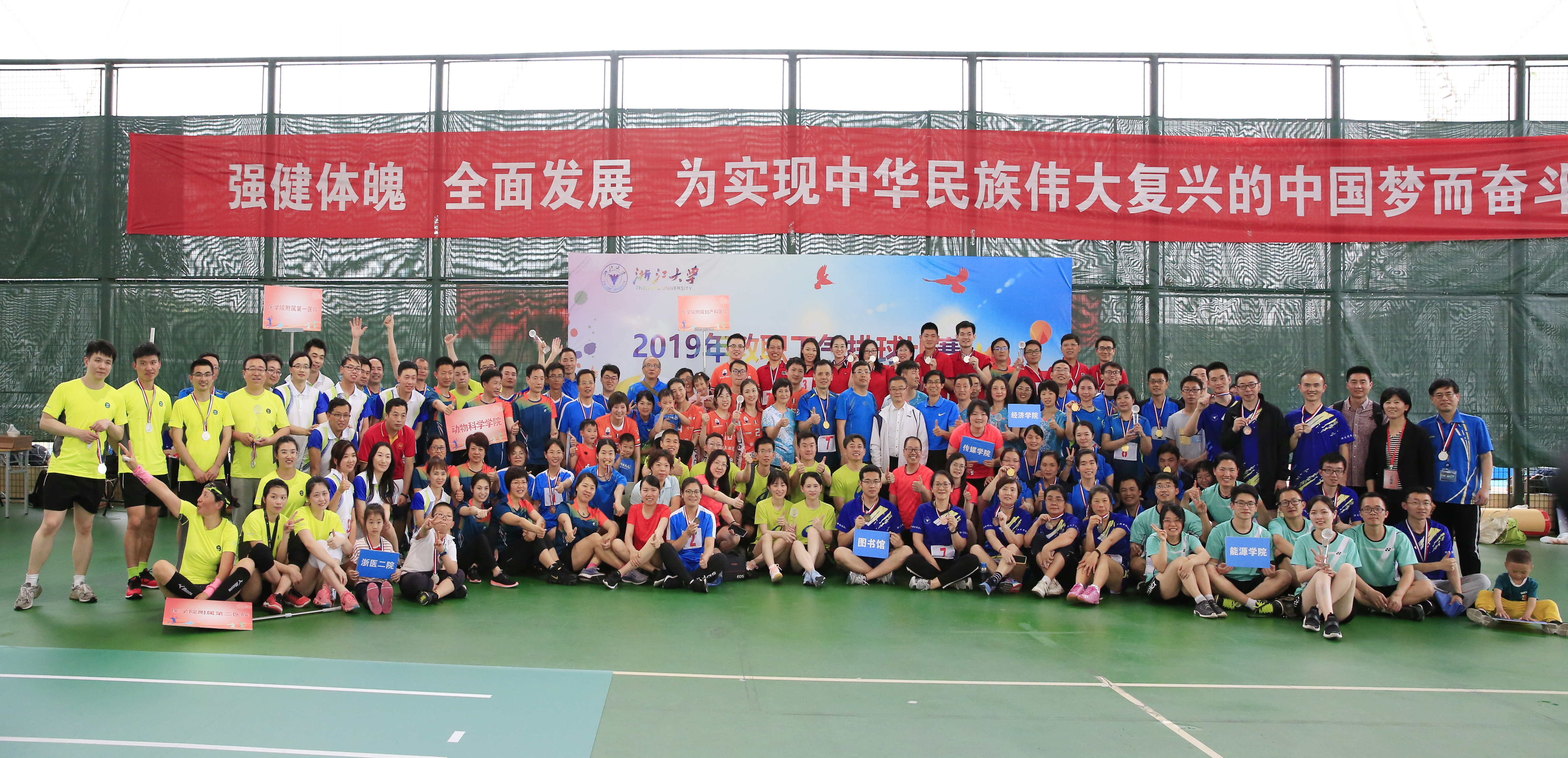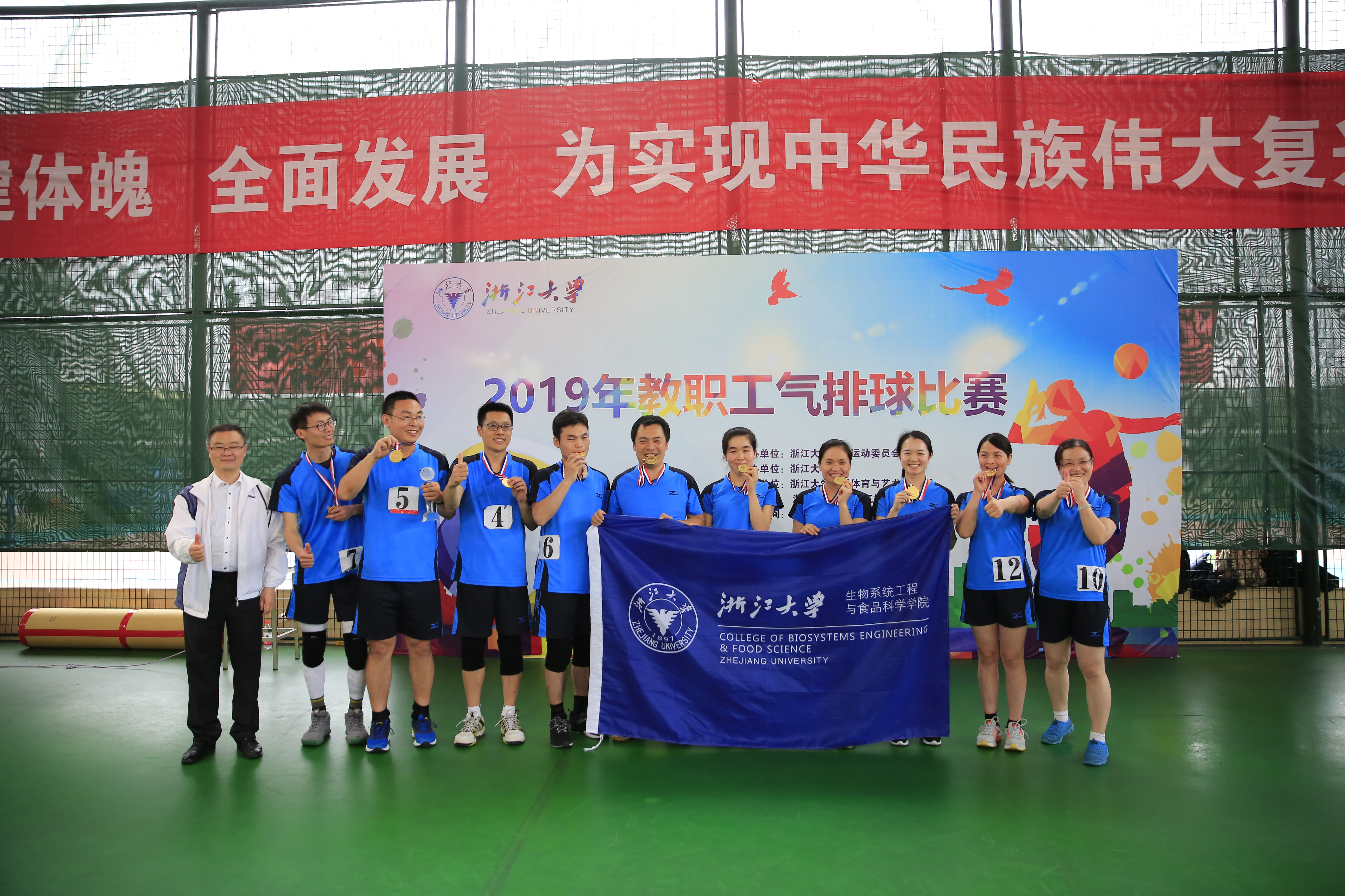 浙江大学2019年教职工气排球赛于5月11日至12日在紫金港校区风雨操场举行。在党委书记王晓燕老师的带领下,生工食品学院气排球队全体健儿经过一个多月的持续训练和周末两天的高强度比赛,践行“笃实、励新、兼容、康健”的院训精神,顽强拼搏,过关斩将,越战越勇,最后以8场全胜的战绩取得院系组第一名的佳绩,捧得浙江大学2019年教职工气排球赛冠军!此项殊荣也是近些年bat365正版唯一官网在学校教职工体育赛事上的最好成绩!