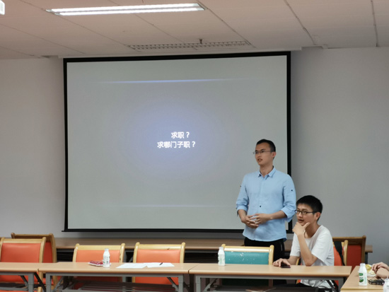 曹明学长从准备、笔试、面试三个方面跟大家做了分享。同时,学长提醒大家要抓住挂职的机会,多锻炼自己。学长提到,现在我们可能还没感受到就业的压力,但应该早做打算,这样才能提早准备好,更从容地面对之后的抉择。