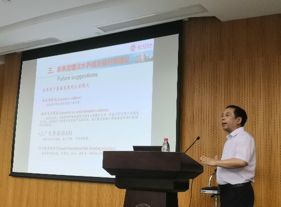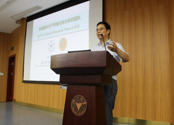 分享会上,湖州师范学院副校长叶金云教授,清华大学环境学院李振研究员、浙江大学朱松明教授分别做了关于中国淡水池塘养殖、微藻在水产养殖中的应用、中国循环水养殖和浙大研究团队的主题报告。