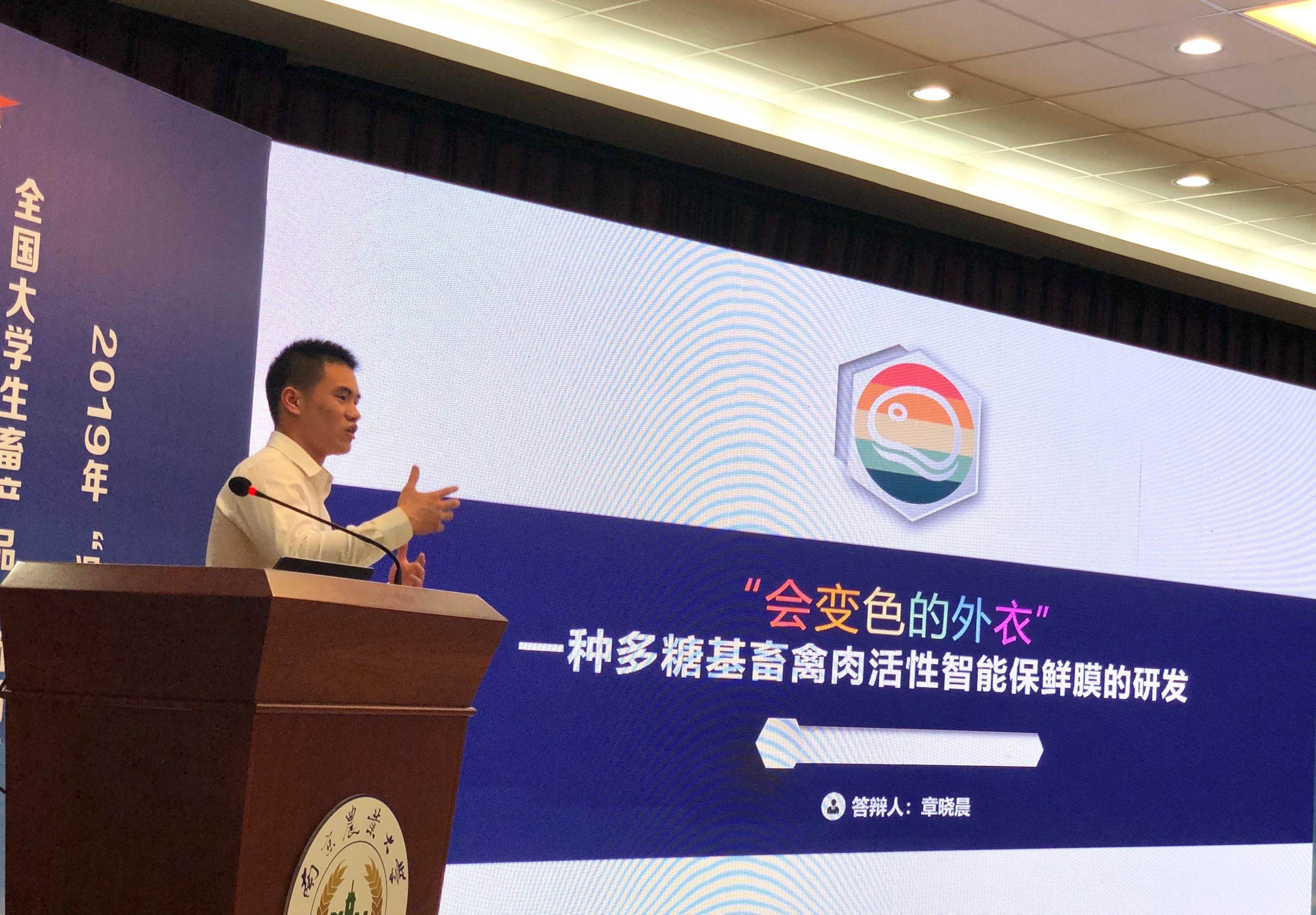 本次大赛的主题是“汇聚青年力量,谱写畜产华章”,由初赛和终身答辩两个环节组成。bat365正版唯一官网学子的参赛项目为“多糖基肉品智能活性保鲜膜”,通过利用没食子酸与果树天然提取物(草莓、油桃皮等)改性羧甲基壳聚糖为原料制备,采用层层自组装成膜技术形成的双层可即时检测肉类新鲜度的智能指标膜,成膜操作简单,具有良好的自修复性、保鲜性与稳定性。在发挥羧甲基壳聚糖抑菌效果、延长货架期的基础上,依据肉类在腐败过程中,蛋白质分解会产生大量挥发性有机胺类造成包肉类表面pH值上升的原理,对肉类新鲜度和腐败状况进行监测检验。