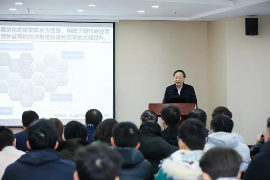 赵春江院士为师生们作玉米表型信息高通量获取研究专题报告,他从作物育种技术发展的四个层次,即传统的经验选择育种、杂种优势育种、现在国际一流种业已步入的生物工程(分子)育种以及未来走向的智能设计育种出发向现场师生介绍了现代商业育种技术体系,即基因挖掘、植物表型高通量测量分析、大规模基因转化、制种与田间测试以及市场推广。