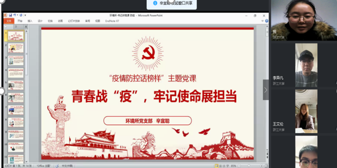 长风破浪会有时,直挂云帆济沧海。这次不“疫”样的党会,丰富了我们党建工作的思路和方式,在这场人民战争中,学生党员也将继续奋战在自己的一线,众志成城,最终一定能够夺取抗击疫情斗争的全面胜利。没有一个冬天不可逾越,没有一个春天不会来临,期待春日在求是园中更好的相遇!