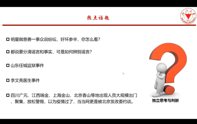 吴晨媛同志认为,我们应该对明星做慈善一事持更加理智的态度,疫情是一面镜子,它告诉我们谁才是我们的榜样,在看到别人的同时,我们自己也要做好自己应该做的。浙江大学学生会执行主席许堪鑫同志则提出了三点倡议,即明辨是非、发挥党员先进作用、积极适应社会和工作的变化,简明扼要地指出了身为学生党员,目前我们应该关注的重点。