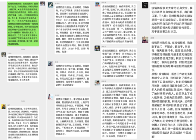 线上视频党支部会议结束后,党支部在微信群进行了一次特别的主题党日活动。各位党员围绕“疫情防控话担当”微话题分享了在抗击疫情过程中的行动和感受,在疫情期间,党员同志能够以身作则做到不出门不聚会,及时向家人和亲戚朋友科普疫情防控的相关知识,面对疫情保持客观冷静,不信谣不传谣,并能够利用自己科研知识为科学防疫做出自己的一份贡献。