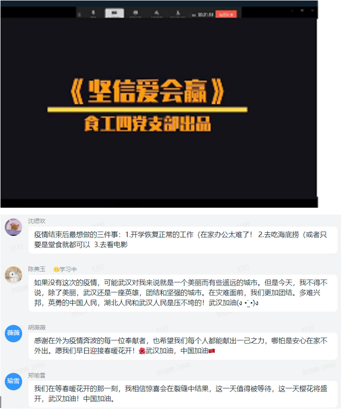 “我们坚信有爱就会赢,无法拥抱却离你最近,真情守望,长江黄河水流长,我们凝聚起中华民族的力量……”首先,播放了食工四部分党员倾情录制的《坚信爱会赢》歌曲MV,疫情可怕,但它更让风雨中凝聚民族力量的中华儿女坚信爱会赢。“世间大爱为武汉祈祷,风雨协心渡,愿安!”然后,部分党员用家乡话为武汉加油,助力武汉,加油中国!“想去吃火锅”、“想回学校”、“想去旅游……”最后,党员们分享了疫情结束后最想做的事,表达了对春暖花开的殷殷期盼、对祖国大地的满满惦念。