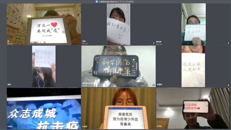 作为首次线上党员大会,在会议的尾声,支部党员们结合“我是党员,我为疫情防控做贡献!”话题“云”合影。党员们通过这张跨越千里的合影,表达对春暖花开的殷殷期盼、对祖国大地的满满惦念。