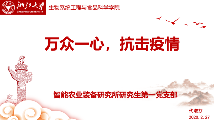 2月27日,生物系统工程与食品科学学院智能农业装备研究所研究生第一党支部围绕“万众一心,抗击疫情”主题召开线上全体党员大会,借助远程会议平台组织微党课学习、微话题研讨,通过一次别开生面的组织生活提振支部全体成员携手战“疫”的必胜信心。