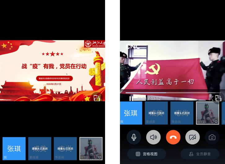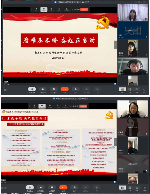 【序言】这是一个不平凡的春天,这是一个特殊的新学期。新型冠状肺炎病毒的席卷改变了每个人的生活节奏和社会步调,全民战“疫”已然打响。当前,疫情形势依然严峻复杂,防控正处在最吃劲的关键阶段。在疫情防控的关键时期,为学习贯彻好习近平总书记重要指示精神和党中央、教育部及学校关于疫情防控的工作部署,巩固“不忘初心、牢记使命”主题教育成果,明确“离校不离教、停课不停学”,生工食品学院各学生党支部积极响应号召,依托网络平台开展了线上党员大会。通过线上主题学习,强化广大学生党员在特殊时期的责任意识、担当意识、奉献意识,通过线上主题党日活动,密切学生党员的相互联系,增强战胜疫情的坚定信心和坚强决心,发挥好广大党员同志的先锋模范作用,以“咬定青山不放松”的韧劲、“不破楼兰终不还”的拼劲参与到战“疫”行动中,共同打赢全民疫情防控狙击战!今日推出食品加工工程研究所研究生第四党支部、食品生物科学技术研究所研究生第三党支部、智能农业装备研究所研究生第一党支部和智能农业装备研究所研究生第四党支部和的组织生活剪影。