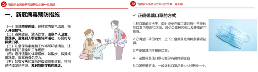 党支部书记代淑芬为党员同志们带来“战疫”微党课——《预防新型冠状病毒》。从五个方面同党员细致讲解了预防新冠病毒的基本措施,还详细讲解了口罩佩戴的正确方式,充分树立支部党员同志相信党和国家的必胜决心,凝聚力量、发挥作用的坚定信心,风雨逆行,万众齐心,我们定能早日打赢这场疫情防控阻击战。