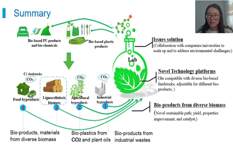 Theincreased production of plastics made people rethink about creating newinnovative approaches to produce biodegradable bio-plastics from renewablefeedstocks. Dr. Cui researched on a sustainable platform of CO2 todevelop new bio-based plastics which aimed at addressing plastic pollutionissues. Materials for sensor was her another research direction. To shortsummary, transforming bio-products or waste to high-value bio-products andbio-materials through novel technology platforms was Dr. Cui’ s long-term goal.Dr. Cui also pointed out that bio-based polyurethane products and bio-chemicalsas well as bio-based plastic products could finally be applied again toagriculture and industry.