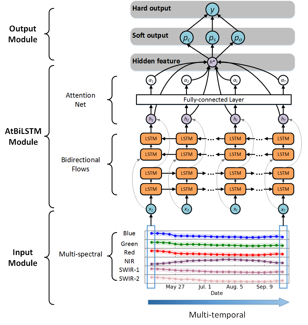 可靠和及时的作物制图对于监测动态作物生长和评估农业资源以实现粮食安全至关重要。准确的作物分布地图能为政府决策支持系统和农业相关应用提供关键信息,包括作物保险、土地管理和供应链物流等。该研究充分利用深度学习技术,开发了一种基于遥感时间序列分析的多时相动态作物制图模型。该模型结构基于长短期记忆(LSTM)单元,并整合了双向数据流和注意力机制,具备从遥感数据中自动高效地捕捉长期时序特征的能力,可以充分利用作物生长过程中的累积效应实现对作物类别的判定。该研究以美国玉米带中六个地区2015-2018年五千多万条像元级样本为数据集,将生长季内相邻间隔7天的23个时间点的LandsatARD多波段卫星遥感观测值作为模型输入。研究使用历年的美国作物分布地图作为地面参考数据,验证了所提出的多时相深度学习模型比Transformer、多层感知器和随机森林模型具有明显更高的分类精度和空间泛化能力。该研究工作为在缺乏可靠地面参考标签的农业地区进行近实时的大规模作物制图提供了一种遥感大数据驱动的解决方案。