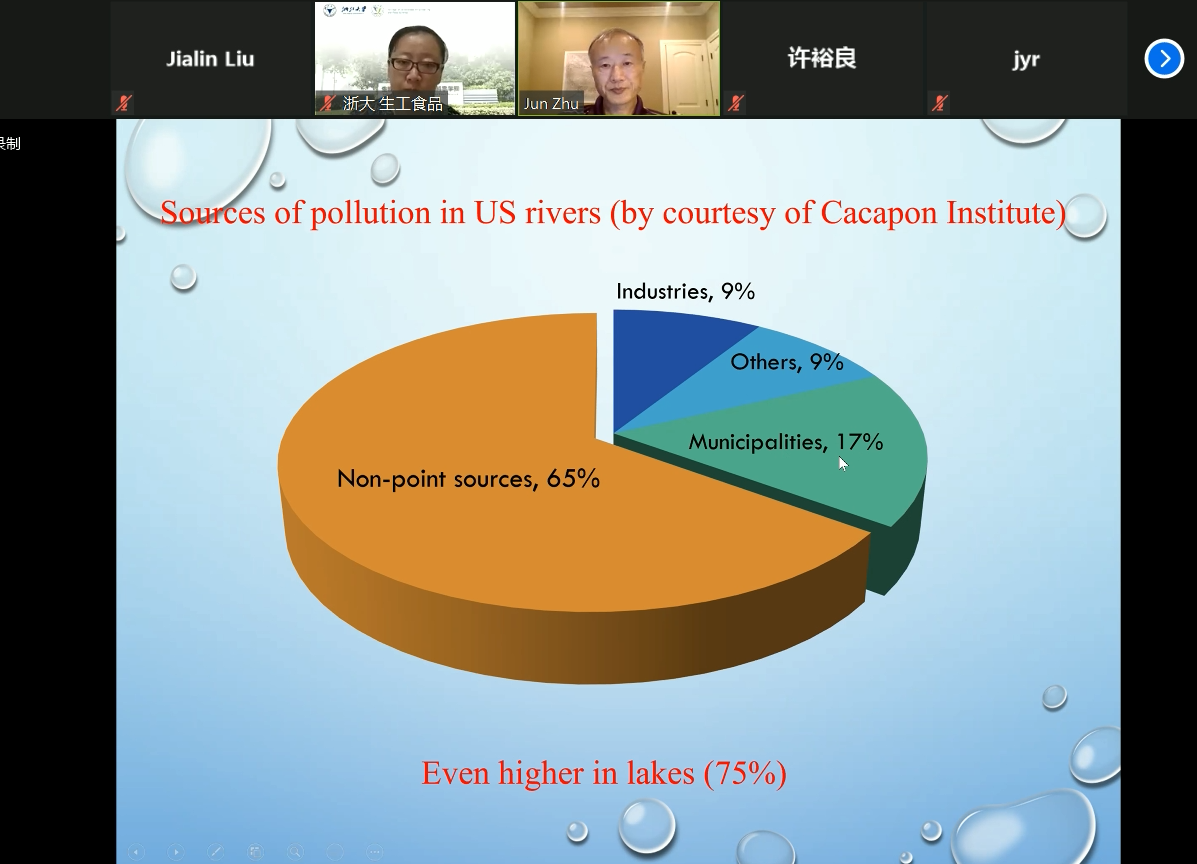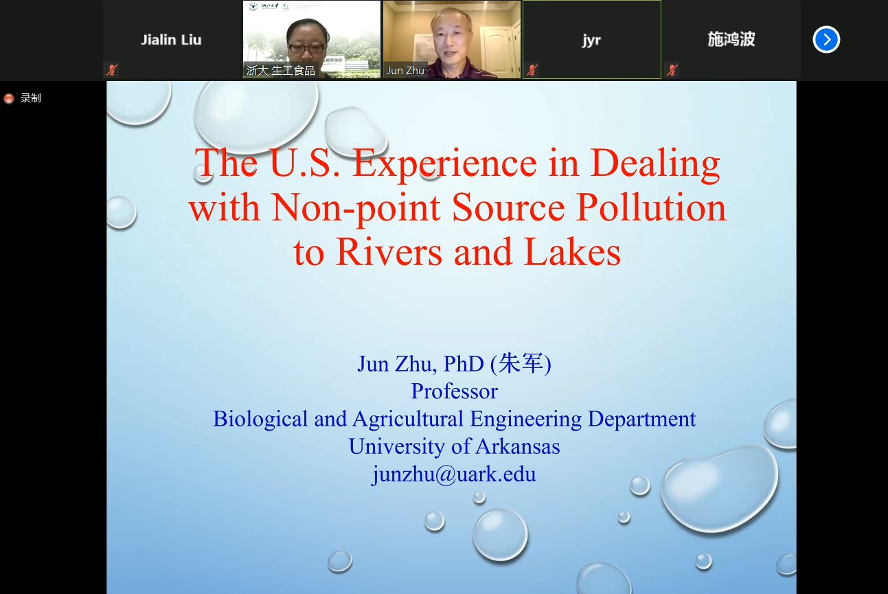 On the morningof August 14, Dr. Jun Zhu from University of Arkansas delivered an online lectureentitled “The US Experiences in Dealing with Non-Point Source Pollution toRivers and Lakes”. Dr. Jun Zhu’s research direction mainly includes wastetreatment technologies for protecting air and water quality related to animalproduction, renewable energy production technologies, bioconversion of wastesinto value-added products. The event was host by Dr. Zhiying Han.