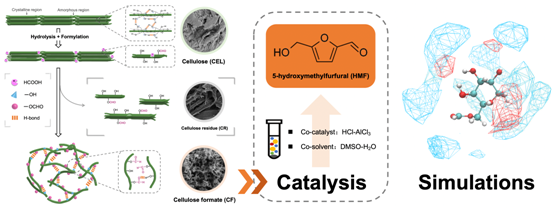 针对上述难题,该研究报道了一种从纤维素高效转化合成HMF的方法,该研究采用绿色可回收的甲酸对纤维素进行化学改性实现纤维素功能化,考察了甲酸改性处理对纤维素的化学成分与结构特性的影响,揭示了甲酸处理过程中纤维素大分子的演化机制;利用Lewis-Brønstedacid组合催化剂对甲酰化纤维素(celluloseformateCF)于DMSO-H2O共溶剂体系中进行催化转化合成HMF,通过分子动力学模拟阐述了纤维素甲酰化修饰与DMSO溶剂的特定作用机理,构建了HMF的高选择性催化反应体系。