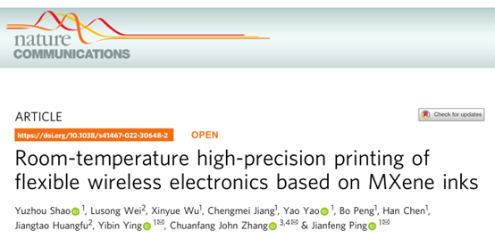 6月9日,bat365正版唯一官网平建峰、应义斌教授团队(IBE)联合浙江大学信息与电子工程学院和瑞士联邦材料科学与技术研究所的合作者在NATURE子刊(Nature Communications)上发表研究论文“Room-temperature high-precision printing of flexible wireless electronics based on MXene inks”(图1)。该研究报道了一种基于MXene水性墨汁的室温直接打印技术,可在多种柔性基底上实现无线可穿戴电子器件的直接适形打印,且无需印后退火等繁琐处理工序。