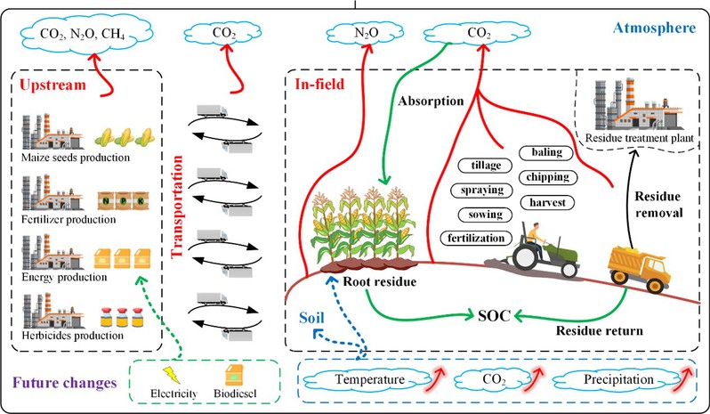 优化农业管理实践(如精准施肥、采取保护性耕作)是保持作物产量、同时减少温室气体排放的关键战略。然而,研究人员更倾向于研究不同农业管理实践对土壤温室气体排放的影响,而忽略了其它环节(如氮肥生产、农业机械使用)所排放的温室气体。因此,使用LCA评估生产农作物的碳足迹是必要且科学的。许多国家已经制定了在2050年左右实现碳中和的宏伟目标,为了制定科学的减排策略,评估未来场景下种植系统的碳足迹意义重大。尽管LCA已被应用于评估农作物碳足迹,但大多都局限在历史场景,且田间部分的温室气体排放结果由IPCC所提供的指南进行估算,难以体现出不同农田间的差异,准确度较低。因此,构建一个适用于未来场景且具有较高准确度的农作物碳足迹评估模型至关重要。