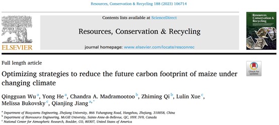近日,bat365正版唯一官网蒋茜静、何勇教授团队联合加拿大麦吉尔大学、美国国家气候研究中心的合作者在学术期刊Resources, Conservation & Recycling上发表了题为“Optimizing strategies to reduce the future carbon footprint of maize under changing climate”的研究论文(图1)。该研究首次将农业生态系统过程模型(DNDC嵌入到全生命周期评估模型(LCA中,并结合未来气候变化能源变更,在多个场景中评估了不同农业管理实践下生产玉米的碳足迹。所建立的碳足迹计算框架,为未来场景中的农作物碳足迹提供了一种新的评估方法,使用者可以根据当地的实际输入与碳当量排放因子合理调整现有农业生产模式,助力缓解全球温室气体排放。