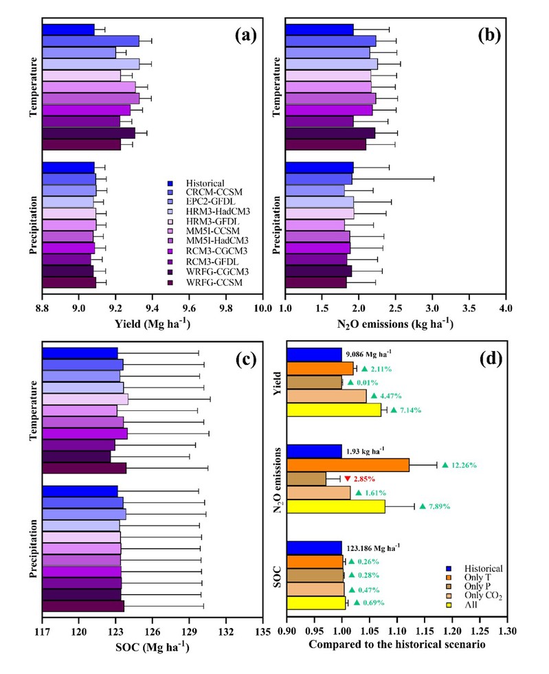 4 未来气候变化对玉米产量(a)、N2O排放(b)、土壤碳固存的影响(c