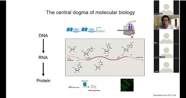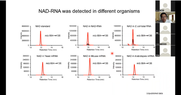 报告同时在线参与人数最高超过200人,包含本科生、硕士生、研究生、以及教师,胡昊博士介绍了实验室近期已发表以及部分未发表的工作,包含NAD-RNA的翻译功能、NAD-RNA在不同组织器官中的分布等工作,为同学们了解研究前沿提供了优质的信息来源。报告结束后,主持人罗自生教授首先与胡昊博士进行学术交流,罗自生教授对RNA表观遗传学的定义以及一些具体的技术性问题、科学性问题包括NAD-RNA翻译可能的机制与胡昊博士进行交流讨论,生科院王志烨研究员也与胡昊博士进行了系列探讨。