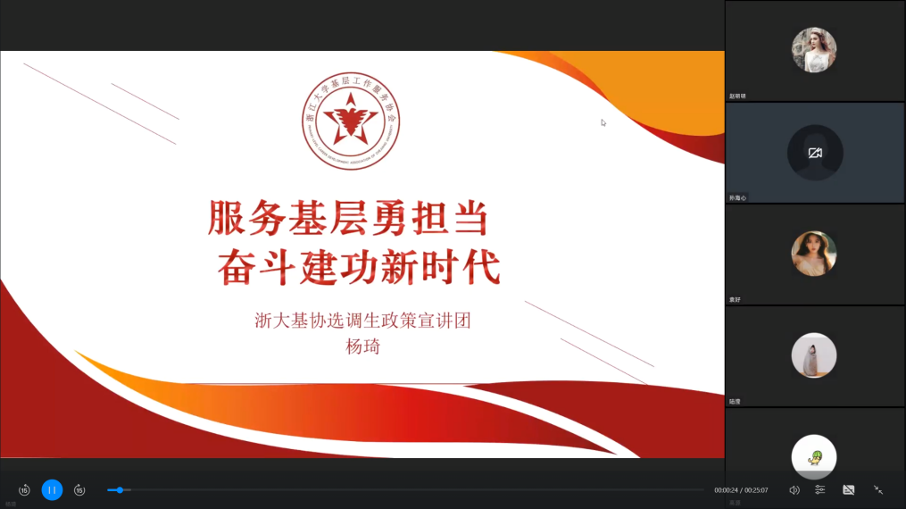 2023年4月10日,浙江大学基层工作服务协会联合生工食品学院智农所、环境所、食工一、信息二研究生党支部成功举办选调政策宣传科普讲座。本次活动以钉钉群视频会议的方式进行,各支部成员高度参与,取得了热烈反响。