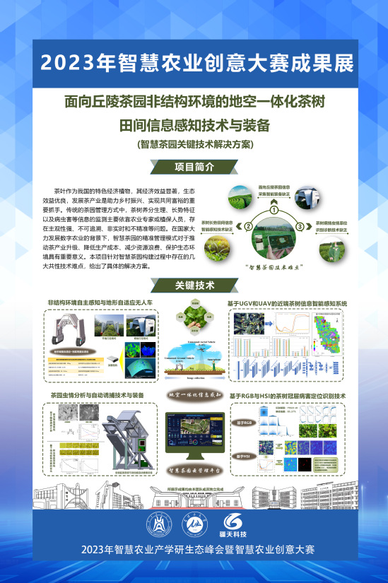 茶叶作为我国特色经济植物,其经济效益显著,生态效益优良,发展茶产业是助力乡村振兴、实现共同富裕的重要抓手。传统的茶园管理方式中,茶树养分生理长势特征以及病虫害的信息的检测主要依靠农业专家或植保人员,存在主观性强、不可追溯、非实时和不精准等问题。在国家大力发展数字农业的背景下,智慧茶园的精准管理模式对于推动茶产业升级、降低生产成本、减少资源浪费、保护生态环境等方面具有重要意义。