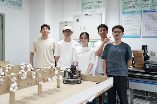 “赛题总体来说难度较大,赛方不仅对机器人的尺寸和控制器总价进行了明确的限制,相较于农业常用的大型采棉机,同学们面临的挑战是在‘螺蛳壳里做道场’;而且为了增加比赛难度,赛场只有前部分设置了寻迹导航线,棉花垄间还进行了镂空处理,对机器人自主导航提出了更高的要求。”叶尊忠介绍。