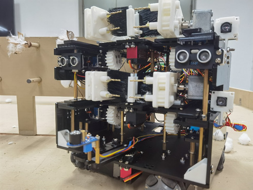 正面的四个金属钻头手爪是标准组Dawn and Darkness队机器人的核心部件,凭借优秀的采摘效率和采摘鲁棒性(在工程和科学领域,鲁棒性指的是系统在面对不确定性、扰动或意外情况下的稳定性和可靠性),棉花机器人可以一并采摘各种形态的棉花;同时,机器人上安装的红外传感器和超声波传感器保证了与棉花所在垄的平行度,使棉花的收集又快又稳。最终,队伍在棉花收集量这一指标上,以48.7g的成绩夺得第一,是标准组所有队伍棉花收集量平均值的3倍多。
