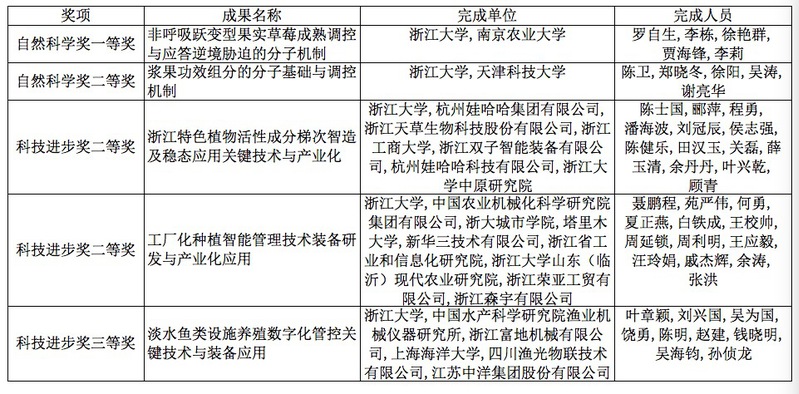 bat365正版唯一官网罗自生教授领衔的“非呼吸跃变型果实草莓成熟调控与应答逆境胁迫的分子机制 ”荣获浙江省自然科学奖一等奖;陈卫教授领衔的“浆果功效组分的分子基础与调控机制”荣获浙江省自然科学奖二等奖;陈士国教授领衔的“浙江特色植物活性成分梯次智造及稳态应用关键技术与产业化”荣获浙江省科学技术进步奖二等奖;聂鹏程研究员领衔的“工厂化种植智能管理技术装备研发与产业化应用”荣获浙江省科学技术进步奖二等奖;叶章颖教授领衔的“淡水鱼类设施养殖数字化管控关键技术与装备应用”荣获浙江省科学技术进步奖三等奖。