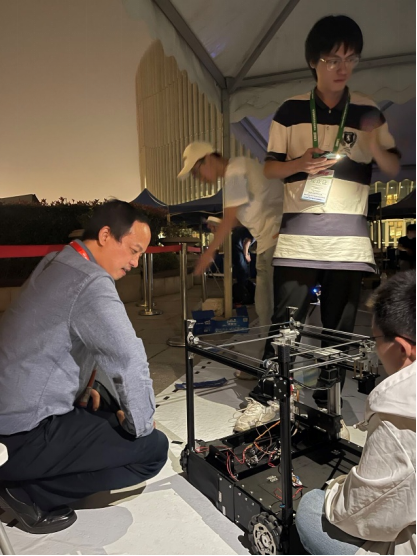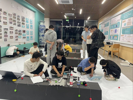尽管受疫情影响,2022年中国农业机器人大赛未如期举行,但这也丝毫未影响同学们2023年的参赛热度。由于2023年延续了2022年的赛题,这对大一、大二首次参赛的同学提出了更高的要求,时间短、任务重、竞争压力大。但同学们夜以继日,排除万难,废寝忘食。考虑到今年比赛难度大,赛方提供的场地不能满足众多队伍调试要求,学生想尽各种办法把各种材料带到武汉,在场馆空地上搭建了一个完整的比赛场地。比赛前夜,学生在已经熄灯的场地上继续调试到深夜,用手机的灯光照亮不断追求卓越的步伐。