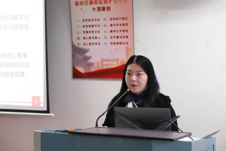 闫凯亚作党支部组织生活规范与实务专题培训。她带领全体党建骨干学习了《中国共产党支部工作条例(试行)》、《浙江大学基层党支部建设标准(试行)》的主要内容,强调要加强支部标准化、规范化建设,严格党员教育管理,严格组织生活。