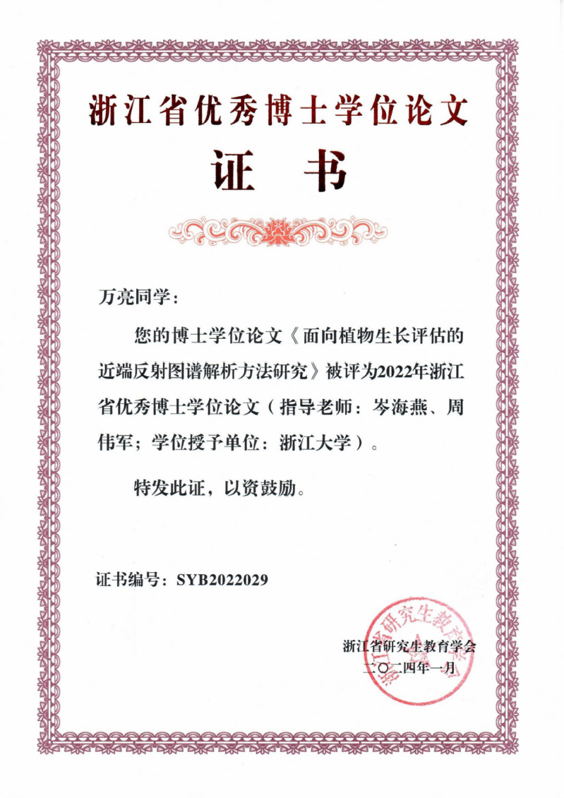 2022年浙江省优秀博士学位论文:《面向植物生长评估的近端反射图谱解析方法研究》