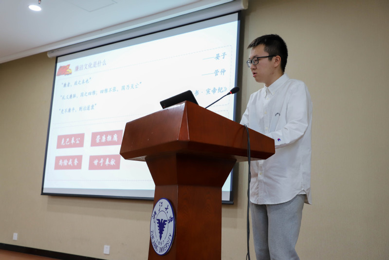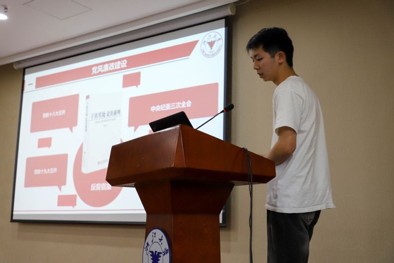 他们以史为鉴,回顾廉政建设历程。朱飞翔以时间为线索,详细梳理了党风廉政建设的发展历程。杨惇泓从古代廉洁文化入手延伸到现代,阐述了廉洁文化的内涵,加深了大家对新时代廉洁文化建设的理解。陈锦从《中国共产党纪律处分条例》出发,剖析了党的纪律处分相关规定,并结合反面案例,强调了遵守党规党纪的必要性、重要性。